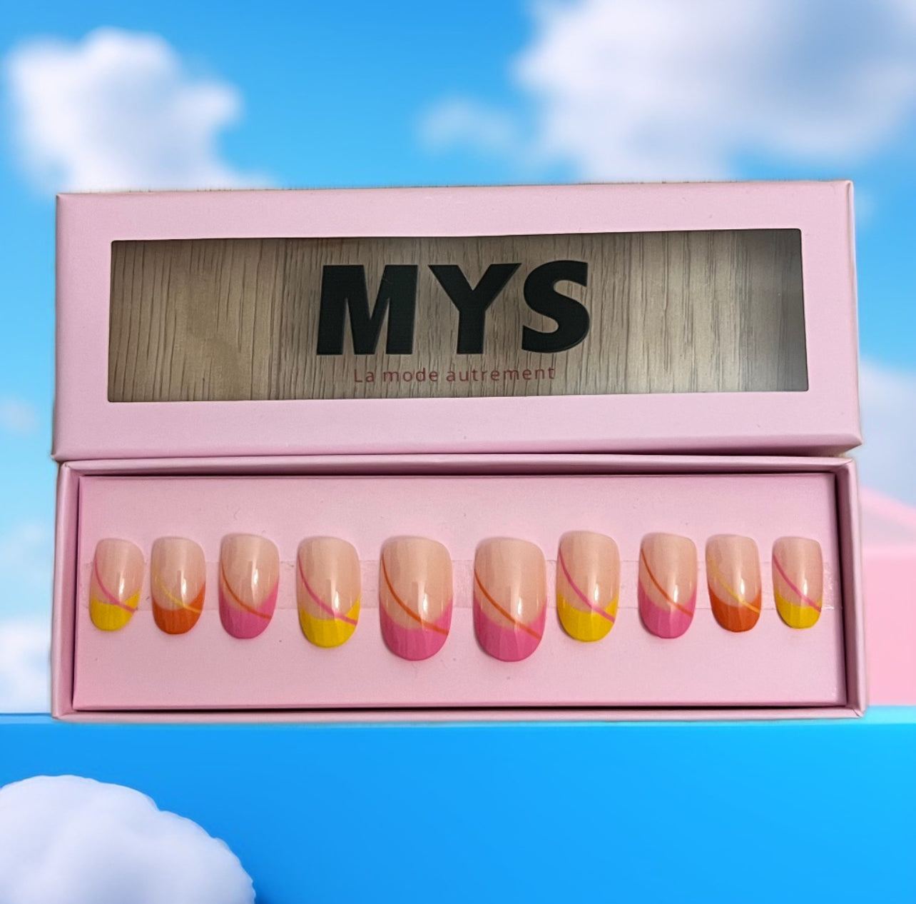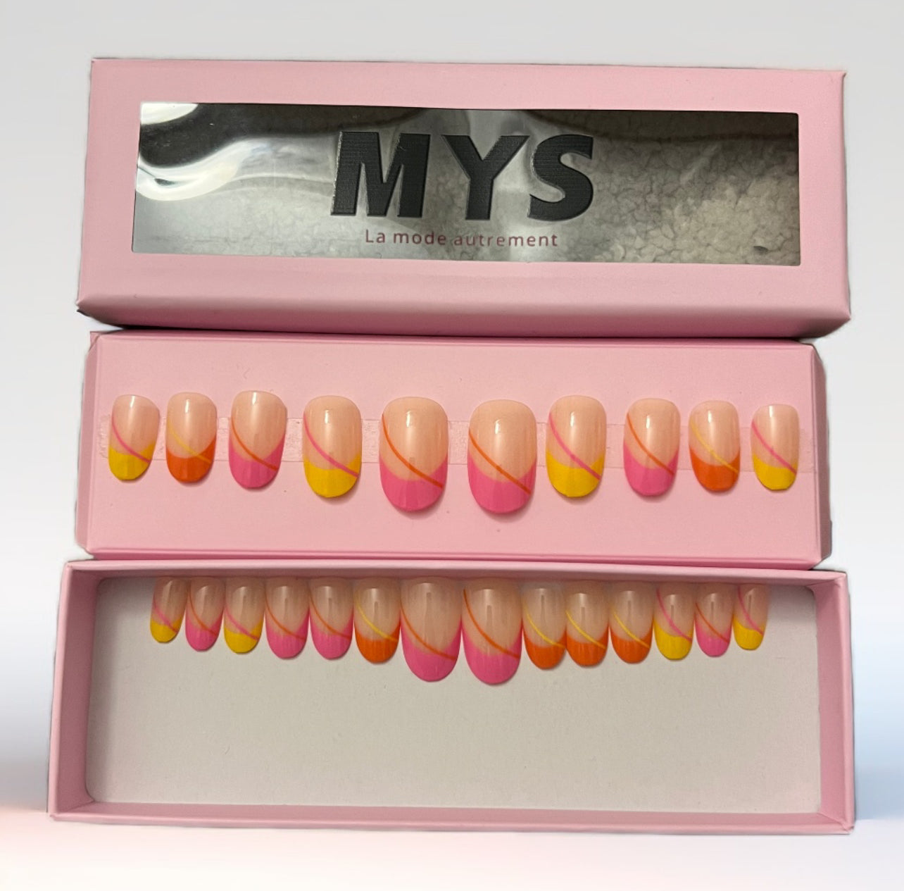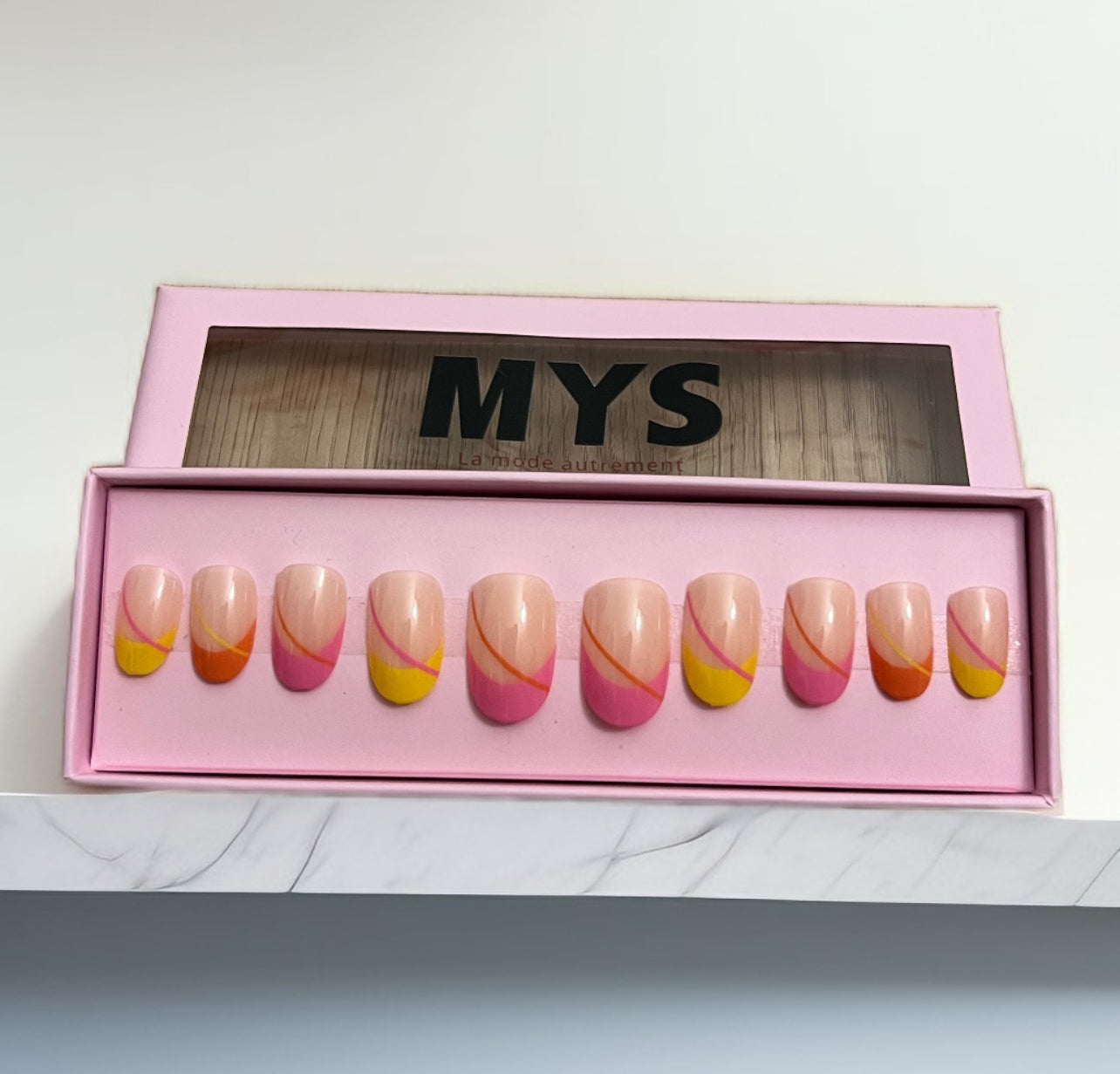 Le coffret contient 24 pièces de faux ongles, un séparateur d’ongles, une lime et deux colles à ongles.
