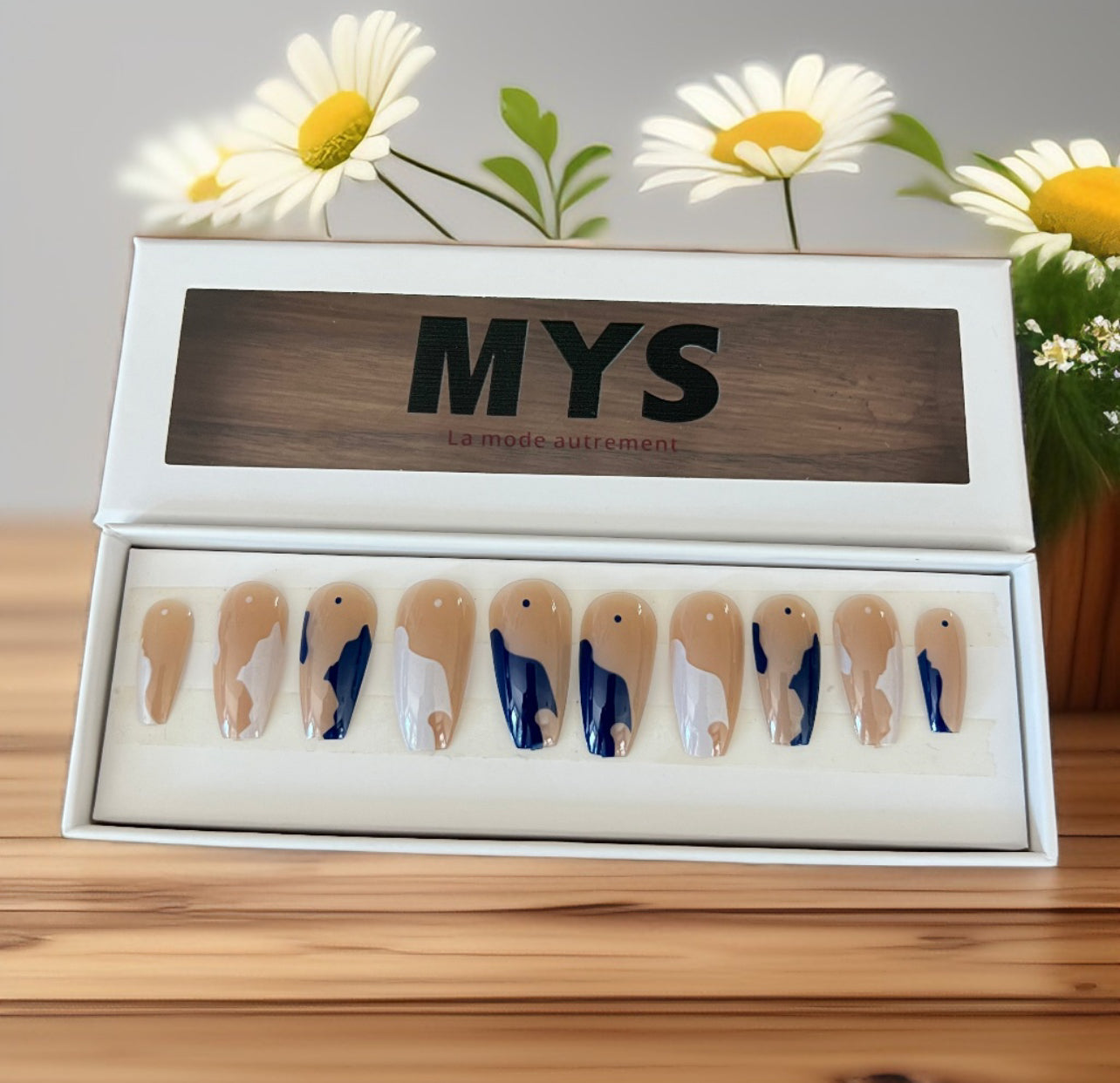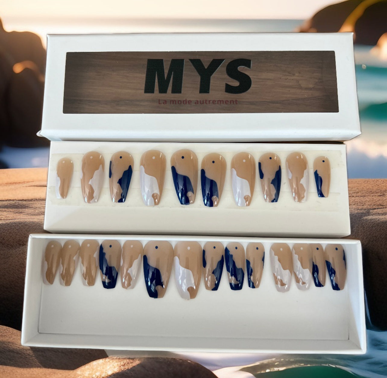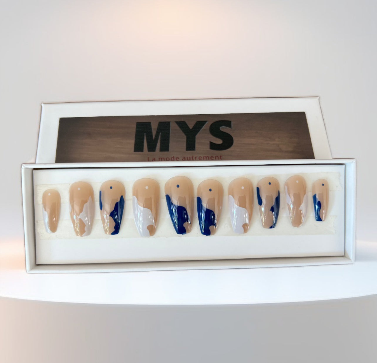 Le coffret contient 24 piĂšces de faux ongles, un sĂ©parateur d’ongles, une lime et deux colles Ă  ongles.