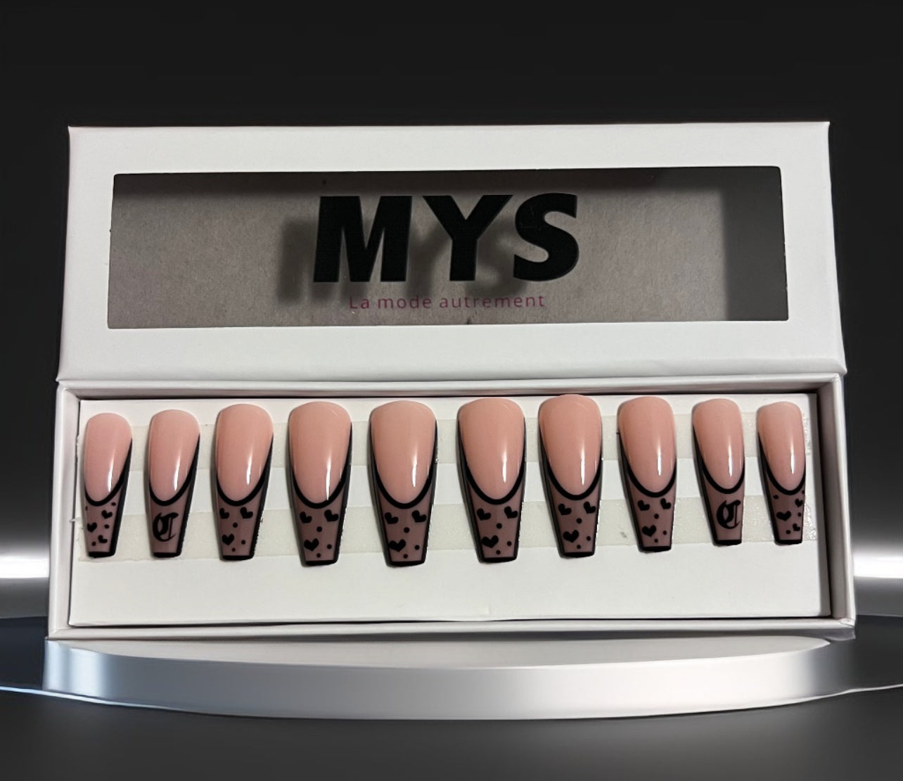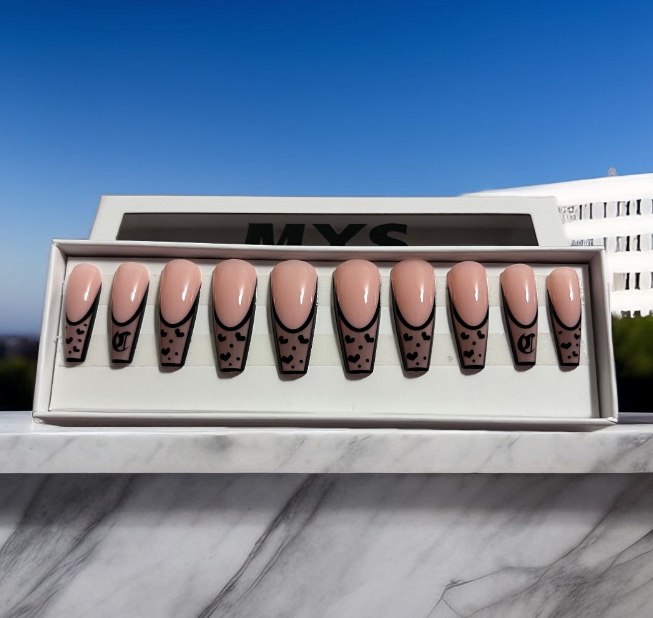 Un mélange de nude et de noir qui crée un contraste élégant. Le design noir en bas de l’ongle rappelle un effet dentelle ou tatouage, ce qui donne un style mystérieux et glamour. Parfait pour les soirées, les événements spéciaux ou pour celles qui aiment se démarquer tout en restant classes.