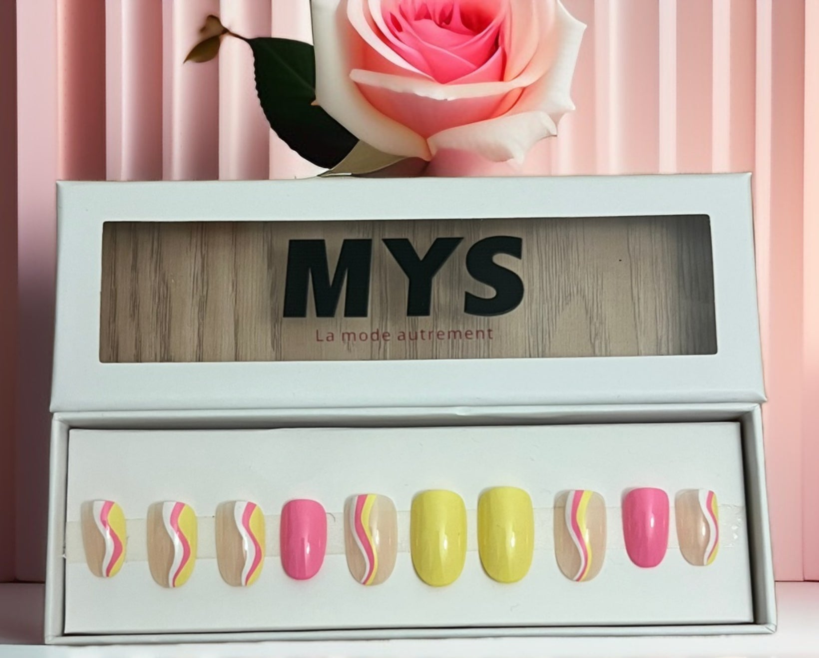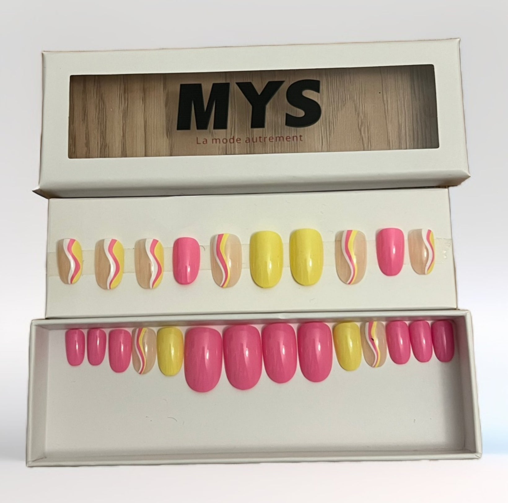 Le coffret contient 24 piĂšces de faux ongles, un sĂ©parateur dâongles, une lime et deux colles Ă ongles.